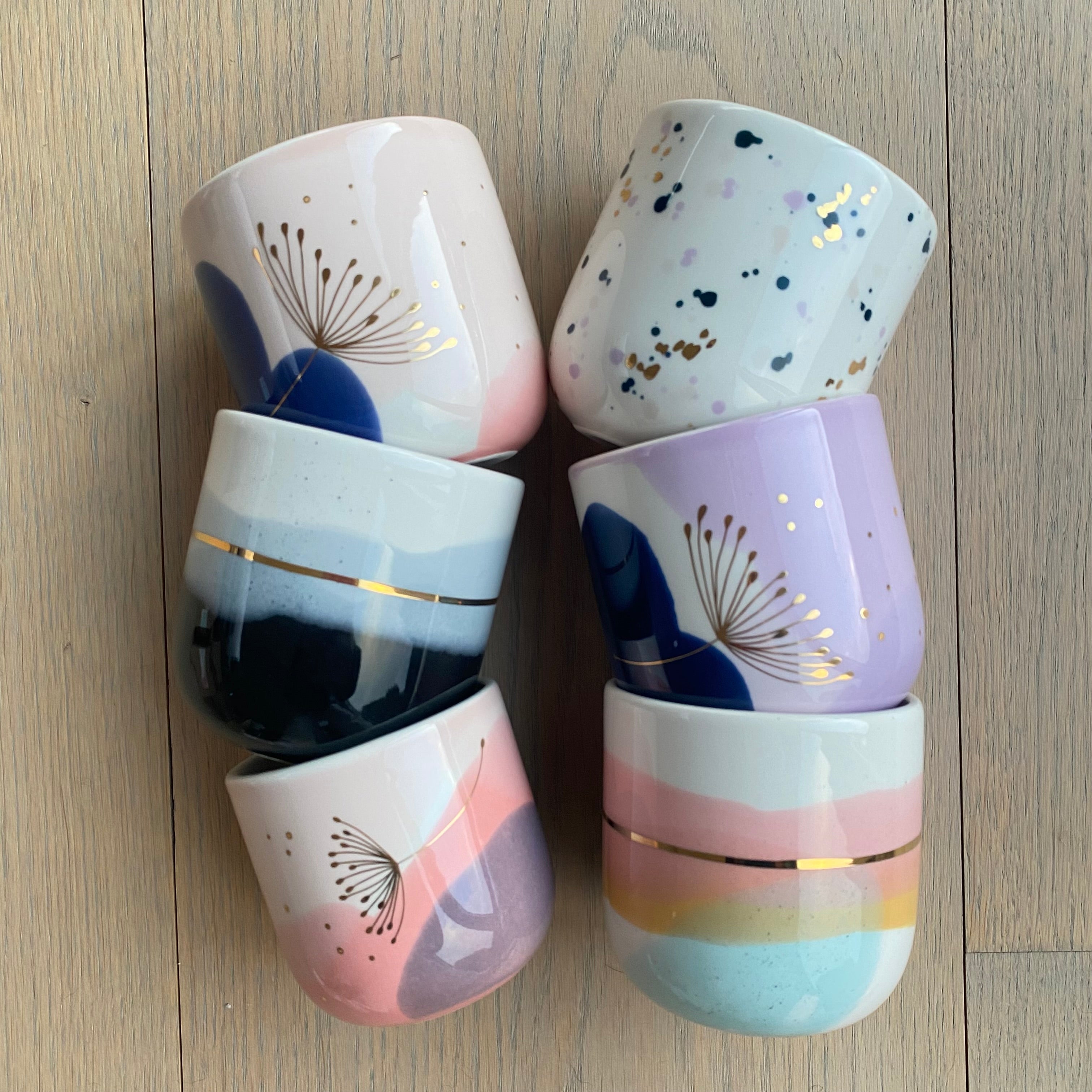 Hånddekorerede kopper og med gulddetaljer