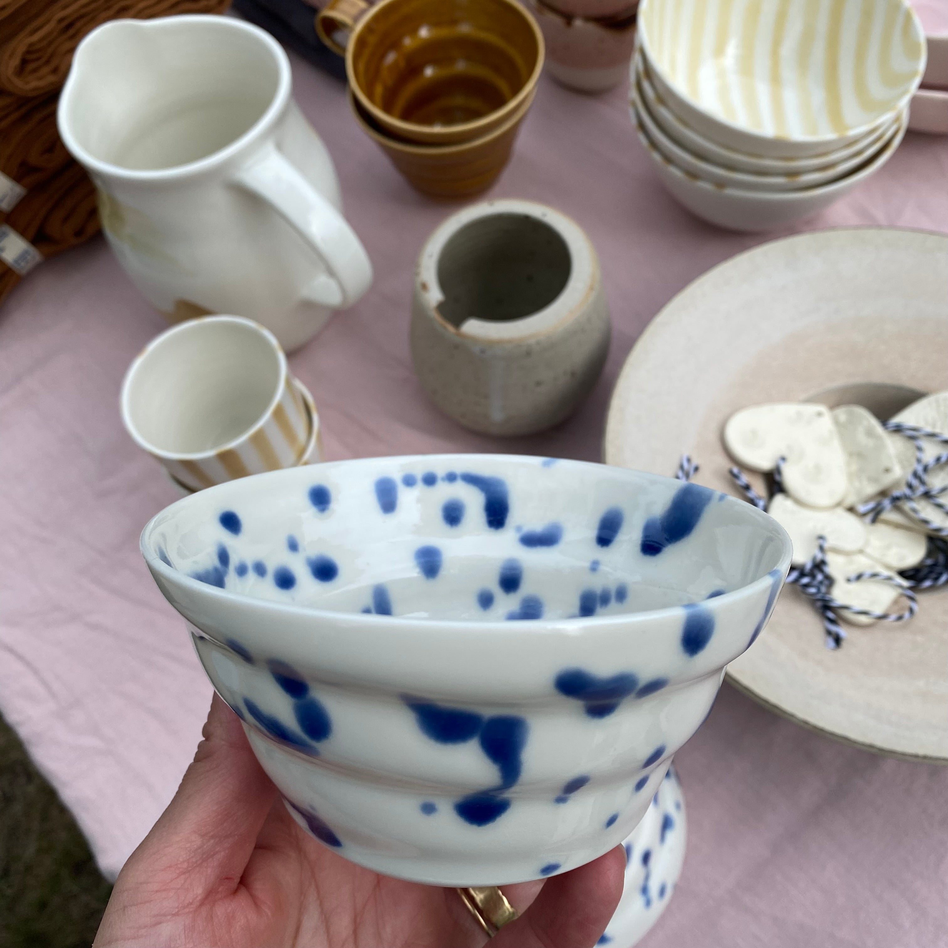 Hånddrejet morgenmadsskål i porcelæn med blå prikker