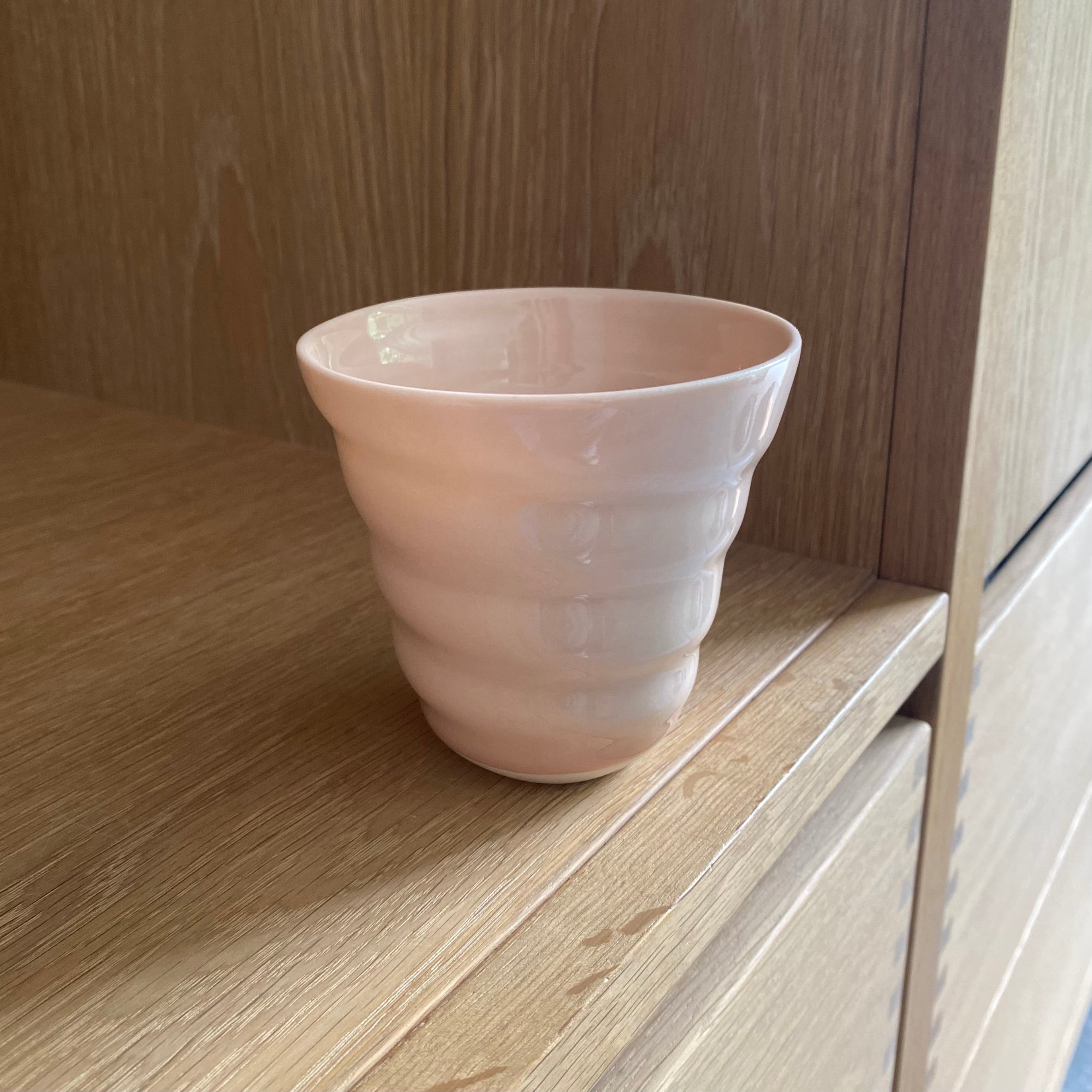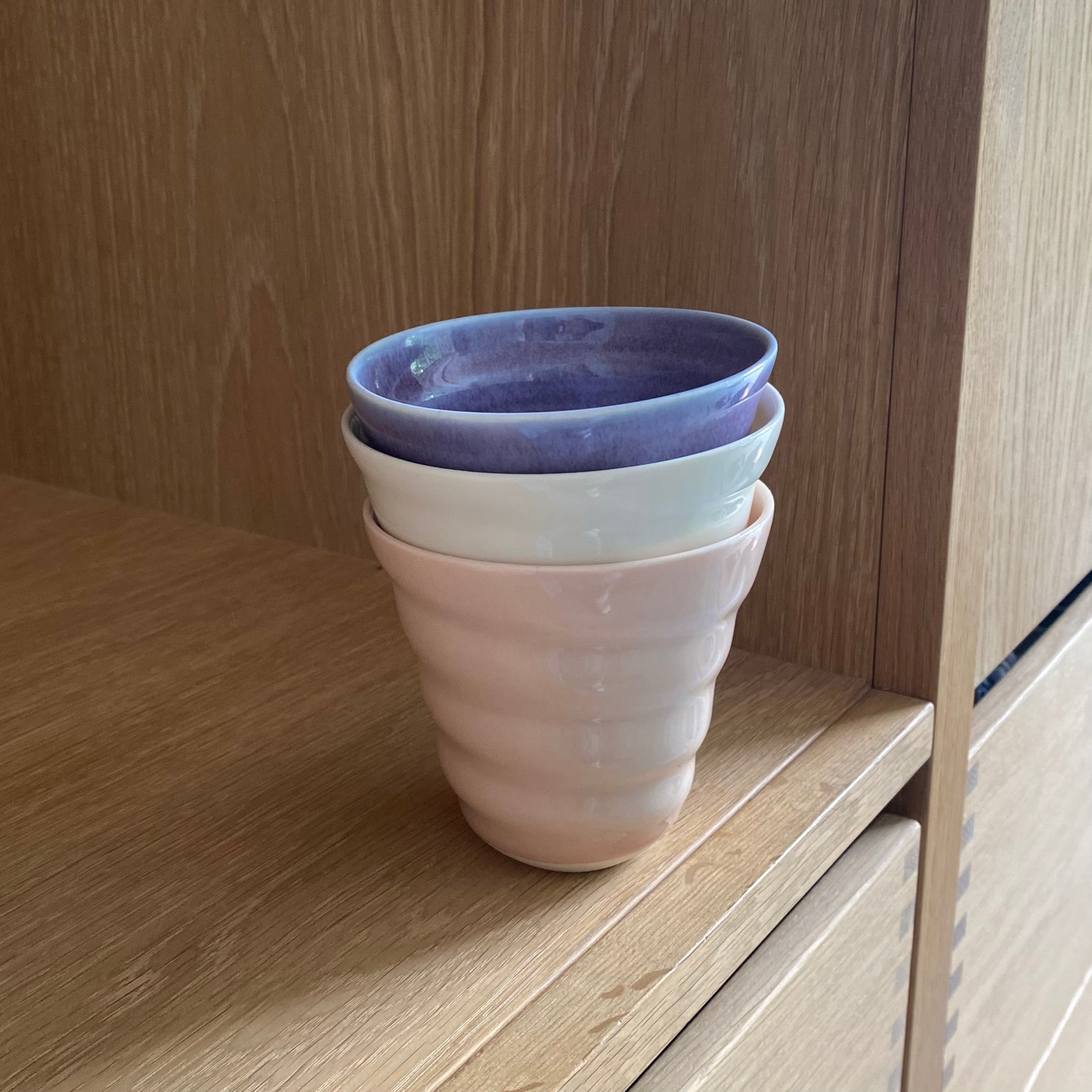 Cortadokop i pudderfarvet porcelæn fra Rikke Mangelsen – set forfra på træbordHånddrejede spiralkopper cortado i flere farver – dansk keramik fra unika:k