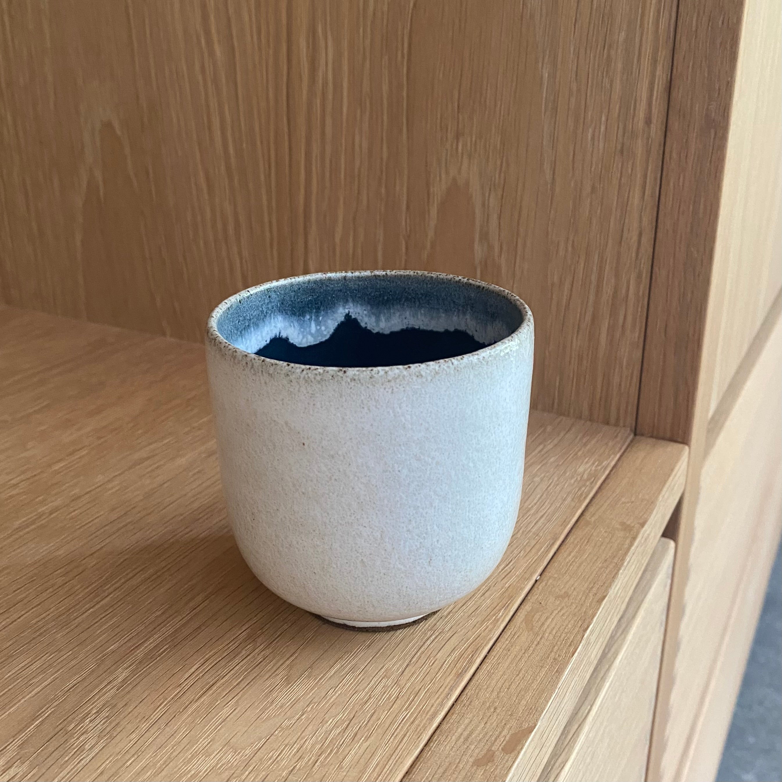 Colour: off white with small chips and dark blue glaze inside, which runs a little at the edge Material: stoneware clay Contents: approx. 2-3 dl Height: approx. 7-8 cm