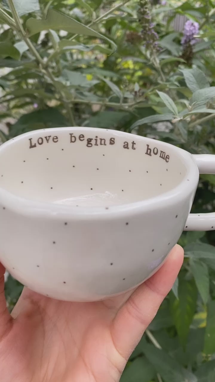 Håndlavet kop med hank og tekst - Love begins at home - personlig gave